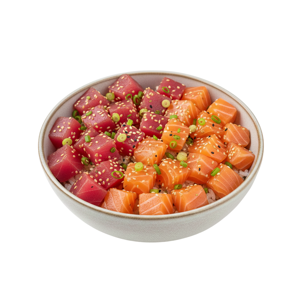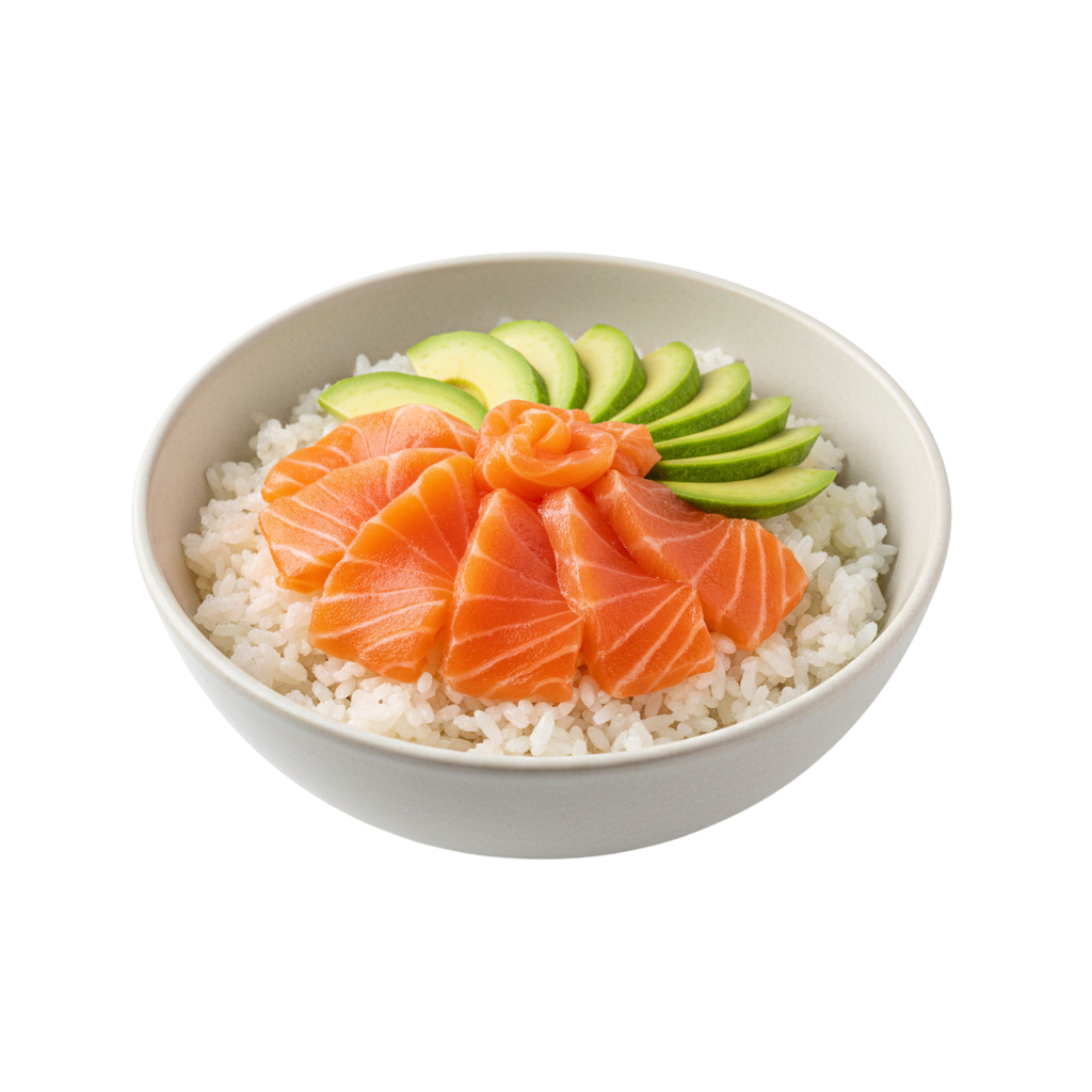 Avocat, roquette, carotte, saumon tataki,...