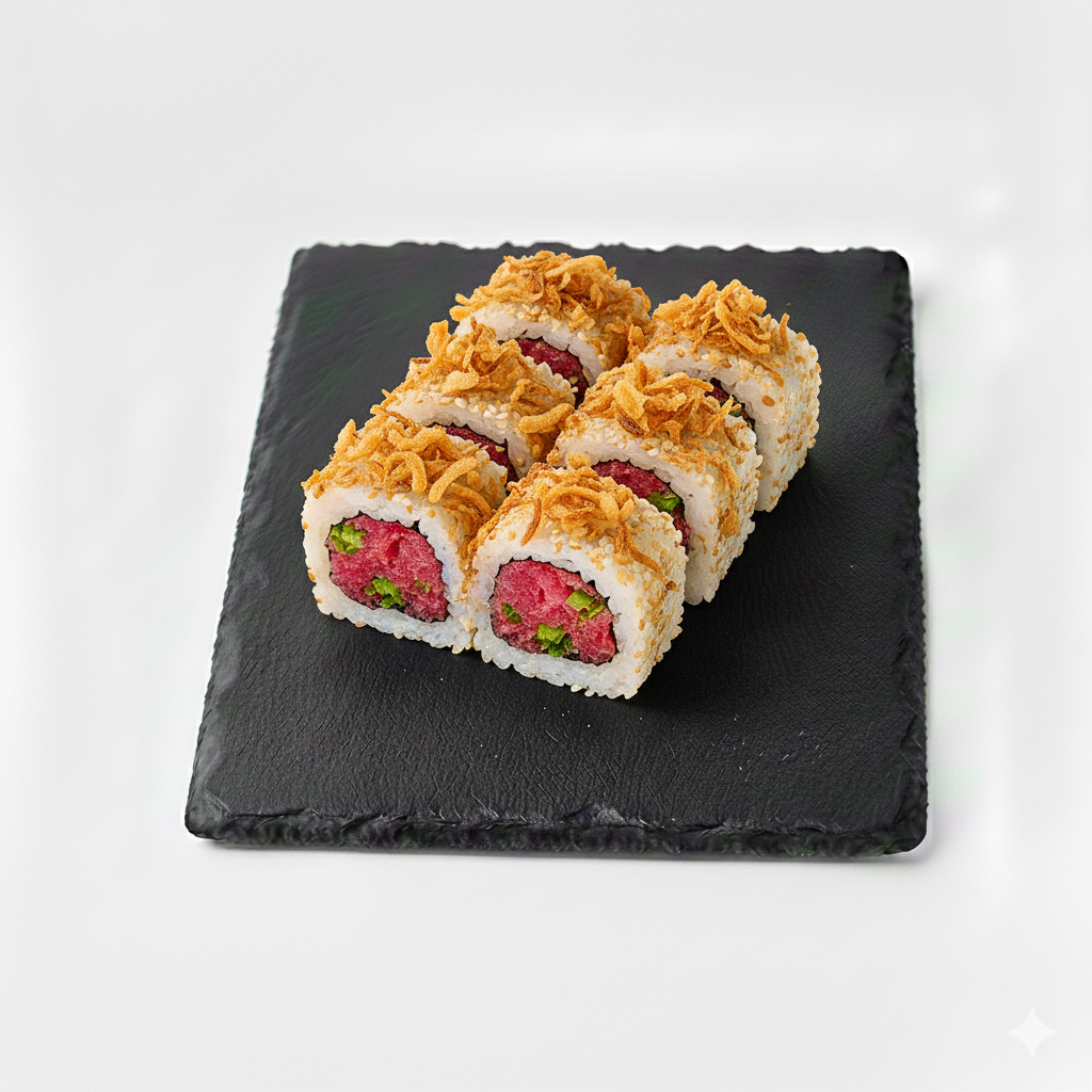 California tartare de thon et oignons frits. Par 6 pièces.