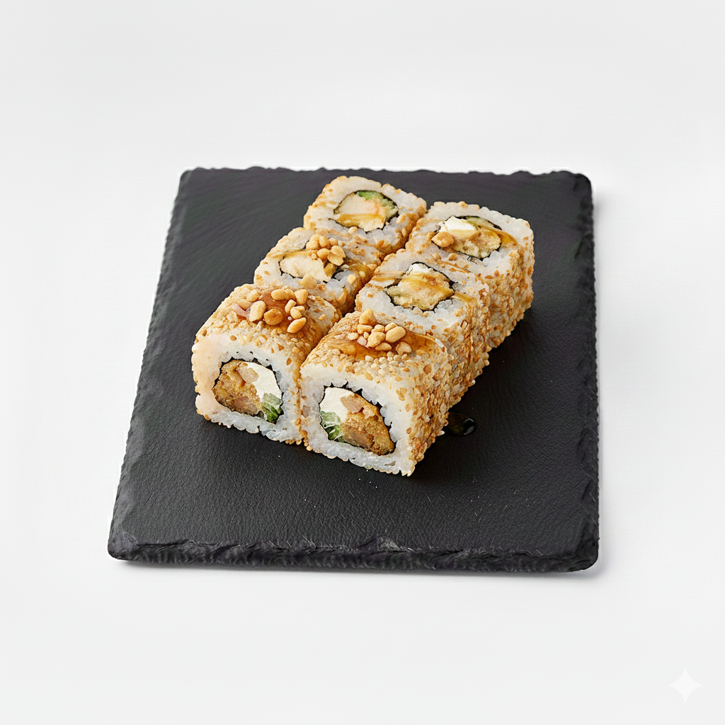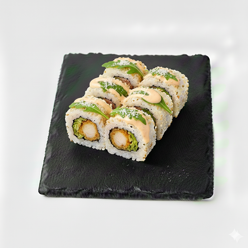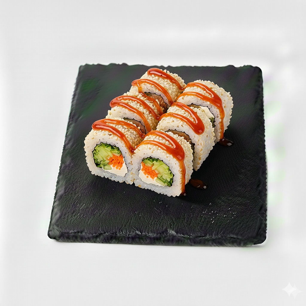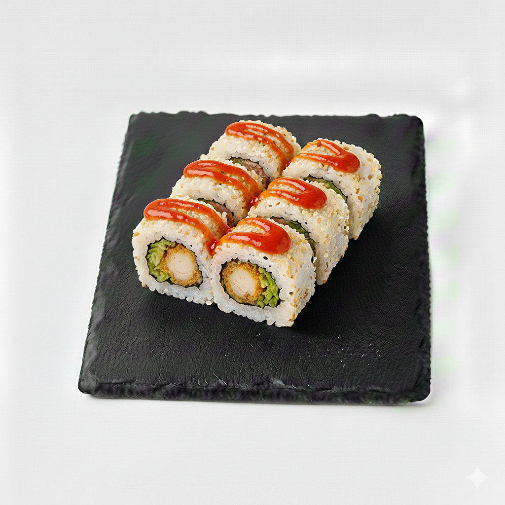 Crevette tempura, avocat, cheese, saumon, sauce chili. Par 8 pièces.